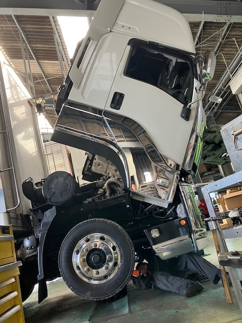 整備士さんが大きいトラックの下に入り作業されていました😊