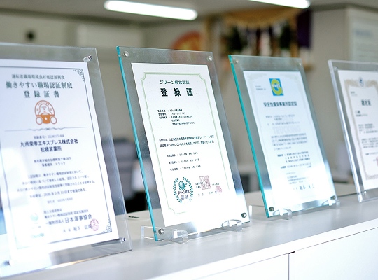 交通安全対策への取り組みが評価された事業所のみが取得できる「Gマーク(安全性優良事業所)」をはじめ、「グリーン経営認証」など、第三者機関からの認証も積極的に取得しています。客観的な評価を受けることで、常に安全・品質レベルの向上に努めています。